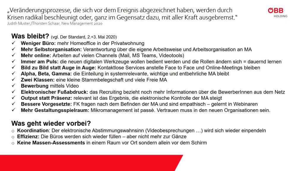 Andere Mitglieder berichten, dass während es in kleineren Firmen mehr ums blanke Überleben während der Pandemie ging, es in größeren Unternehmen teils konträre Ansätze gab: während manche darauf bedacht waren, dass keine cluster entstehen, galt in anderen Anwesenheitspflicht, teils auch ohne Maske. Je besser die Kommunikations- und Vertrauensbasis schon vor der Krise war, desto flexibler konnte auf die neue Situation reagiert werden. Der fehlende persönlichen Austausch wirkte sich negativ auf dieses Vertrauensverhältnis aus, teambuilding und onboarding gestalteten sich virtuell schwierig.