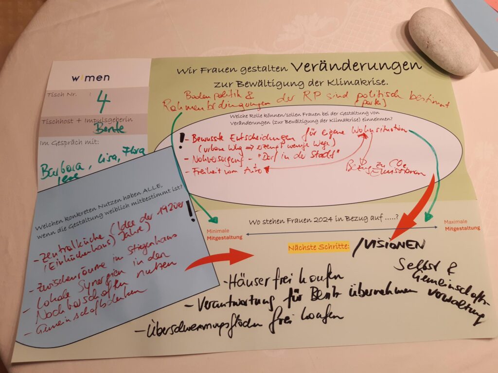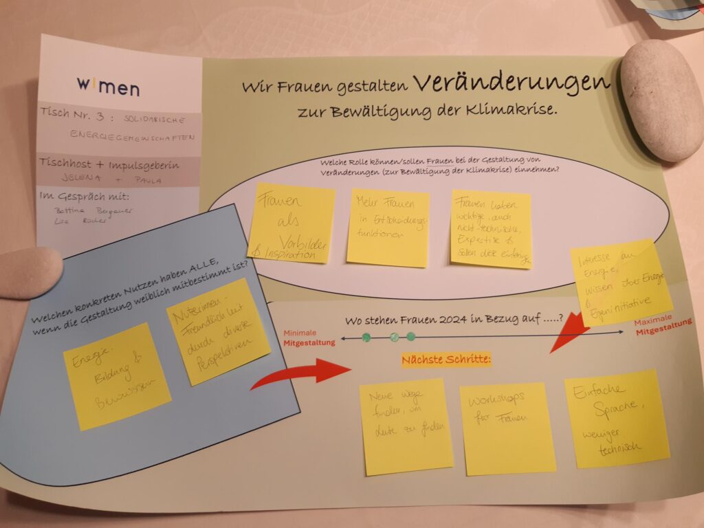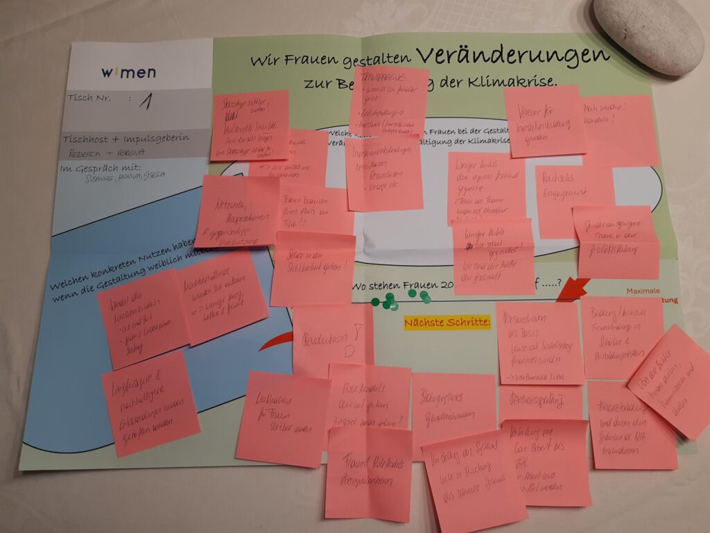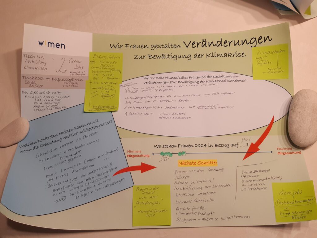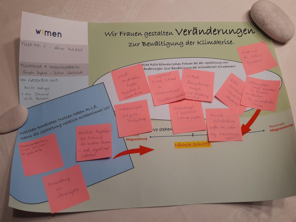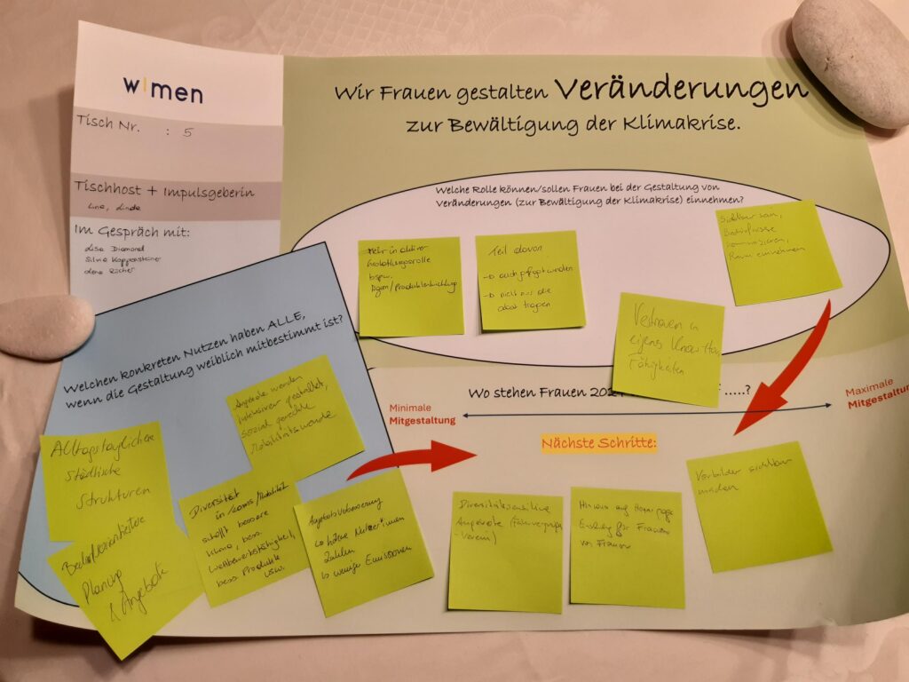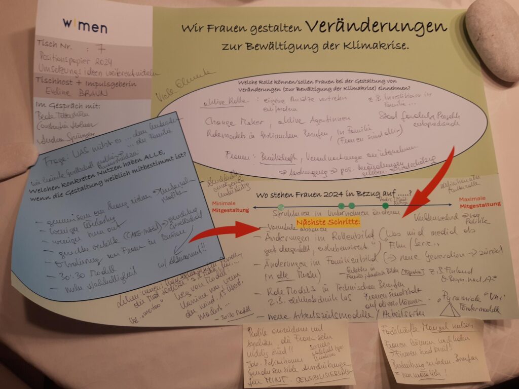 Im Anschluss an zwei sehr motivierende Videobotschaften von Frau Ministerin Gewessler und Frau Grossmann, EU-Parlament, fanden Austausch und Diskussion zu acht ausgewählten Themen (siehe Programm) unter dem Motto „Wir Frauen gestalten Veränderungen zur Bewältigung der Klimakrise“ statt. Die entstandenen Tischplakate finden Sie im Anschluss.