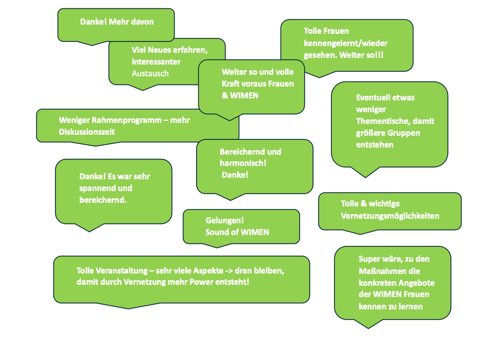 Eine inhaltliche Nachlese ist in Ausarbeitung. Die Diskussion und Vernetzung bei der Veranstaltung soll Grundlage für weiteren Austausch sein. Danke an Eveline Braun/WIMEN, die vor Ort alles im Blick hatte und an die Hosts und Impulsgeberinnen sowie die Teilnehmer:innen für die wertvollen Diskussionen.