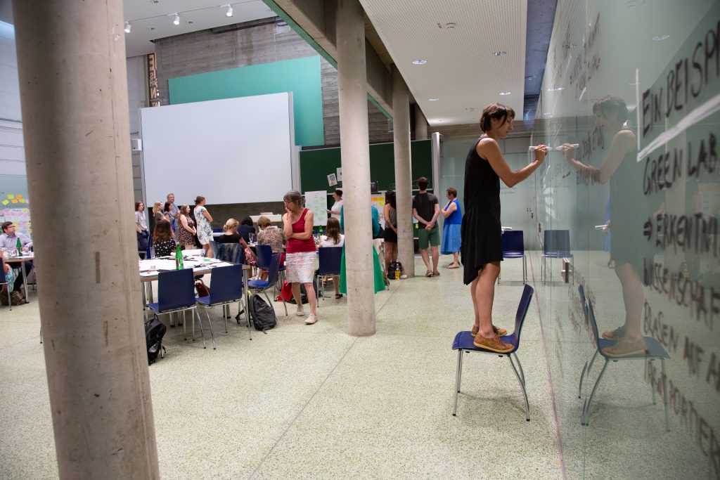 Es gab ein sehr spannendes Rahmenprogramm mit einem Poetry Slam von Mona Camilla und einer Künstlerin, die auf einer riesigen Glaswand Gesprächsfetzen aus den Diskussionen und Beiträgen festgehalten hat. Die Diskussionen rund um die Impulse waren spannend und engagiert. Eine Zusammenfassung fand aus der Perspektive der Politik, der Medien und der Kunst statt.